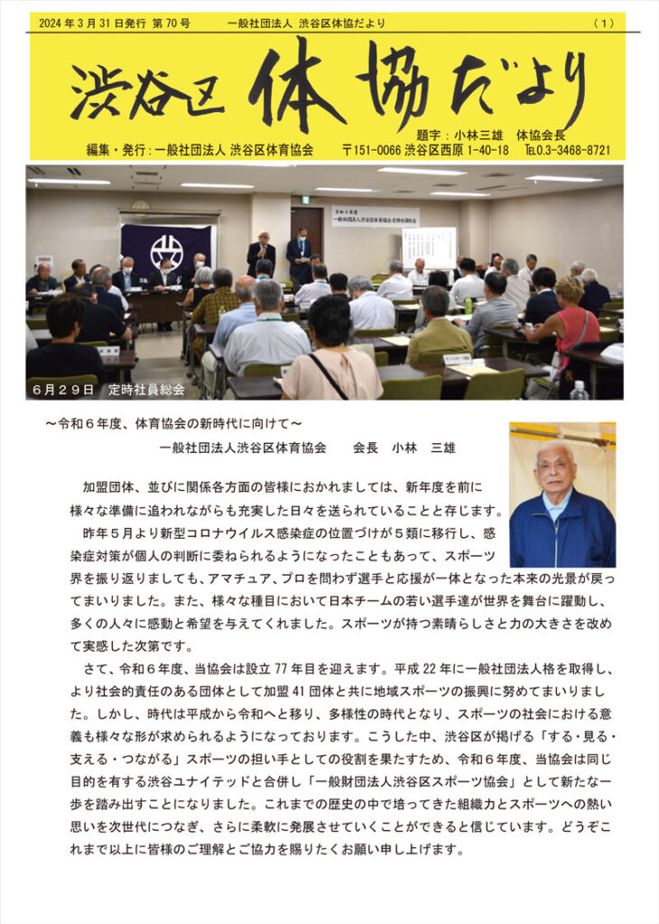 | 2010 | 3月17日設立総会が開催され、一般社団法人渋谷区体育協会が設立 代表理事に小林三雄氏、専務理事に野末雅文氏 就任 |