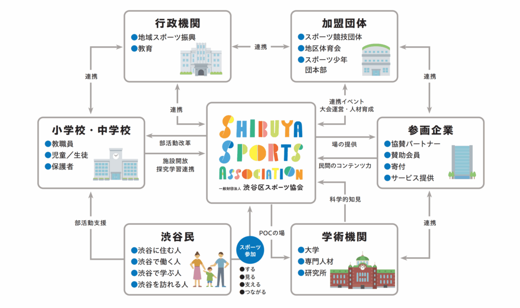 渋谷区スポーツ協会はスポーツを軸に、渋谷に関わる人はもちろん、行政機関や学校、各種団体や企業など多様な人と組織がつながることで、地域のリソースを最大限に活かしながら持続可能なウェルビーイングを実現するプラットフォームを構築します。