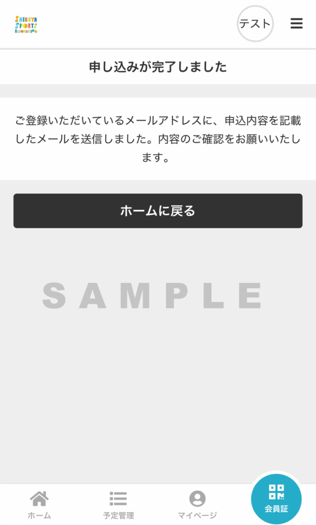 「メールアドレス認証」画面が開きましたら、会員登録は完了となります。次に抽選の申込に進みますので、画面左下の「ホーム」を押します。