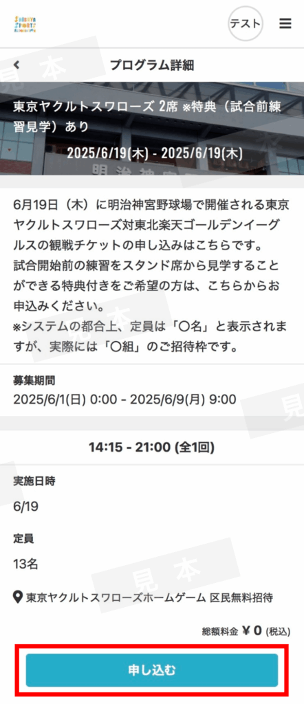 下記の「東京ヤクルトスワローズホームゲーム 区民無料招待」に申込む(メンバーサイト)」ボタンより、お申込みください。※会員登録(無料)が必要となります。