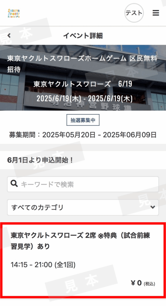 席種:内野席、外野席(申込グループは連番で一緒に観戦できます。)※席種は自動的に抽選になるため、選べません。